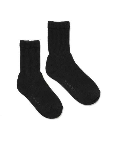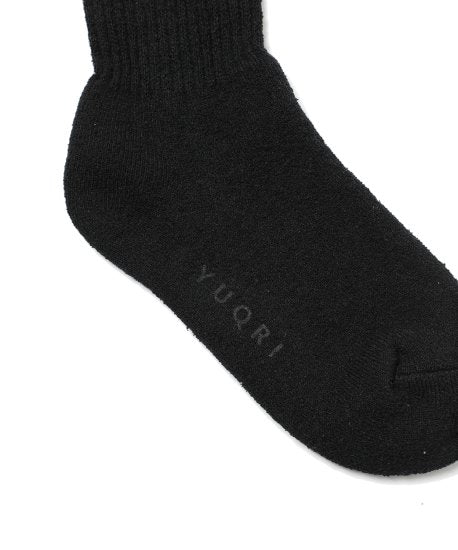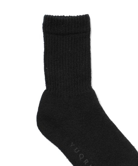 肌あたりの良いドライタッチのループヤーンを使用。ループ状で膨らみのある糸をパイル編みにすることで、さらにクッション性を感じる履き心地になっています。口ゴム部分は締め付けが少ないよう、敢えて少し緩くすることでゴム跡がつきにくくストレスを感じない仕上がりに。ふんわりした履き心地とサラッとしたタッチ感が新鮮。日本国内にて希少な編機で作り上げられた新作モデルです。