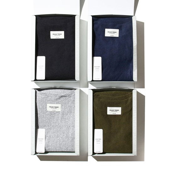 HOLIDAY TRUNKSが贈る4色のバリエーション。どんなライフスタイルにも自然に溶け込み、おうち時間からお出かけまで、毎日を心地よく彩ります。